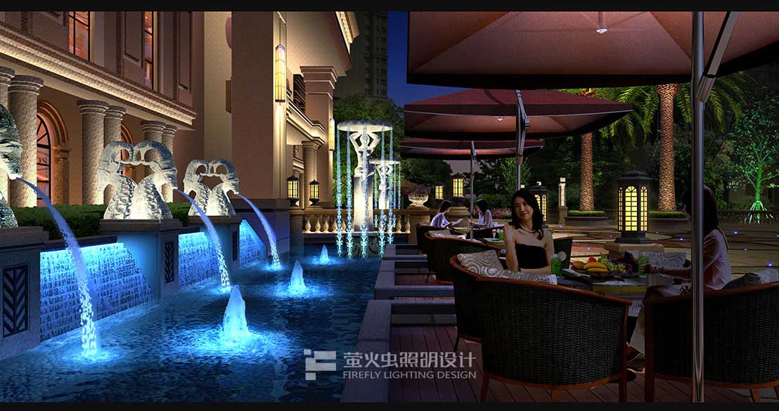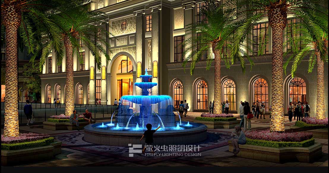 灯光突出建筑阶梯状、主立面中心收分的造型 、强调对换、追求宏大的气魄。