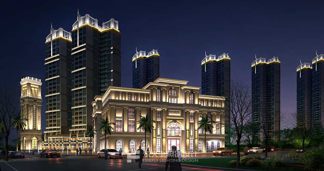 灯光强调高耸的立柱装饰、形成竖三段立面构图、强调建筑物的高耸、挺拔,给人以拔地而起、傲然屹立的非凡气势。